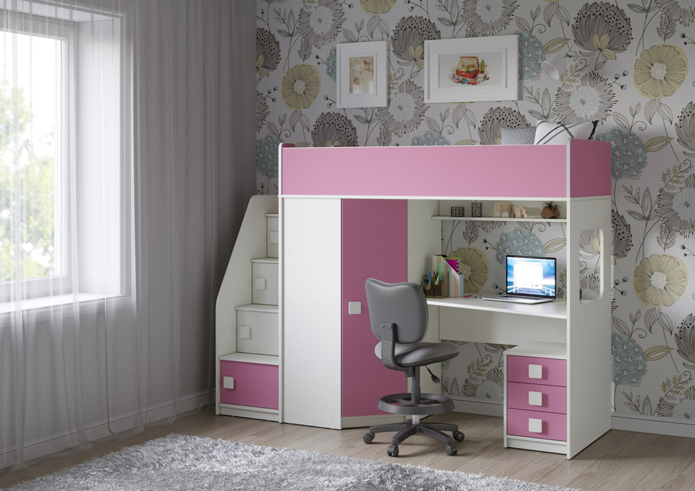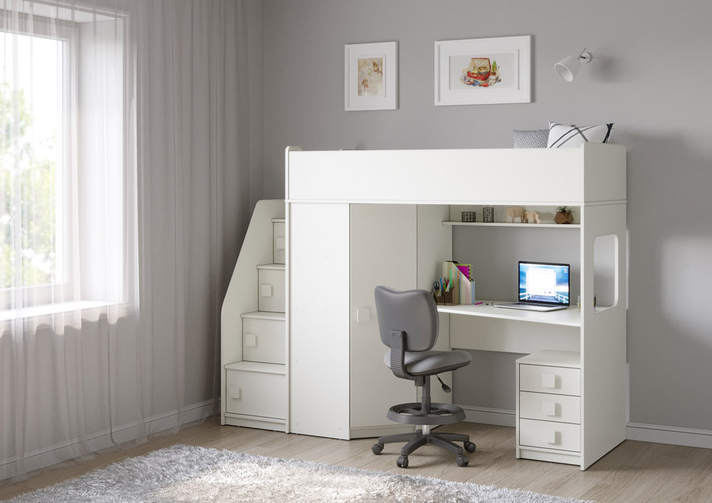 Учебная зона со столом под спальным местом открывает возможности для письменных работ, а также здесь удобно расположить ноутбук. Тумба Л-04 обеспечит хранеие канцелярских принадлежностей и учебников.
